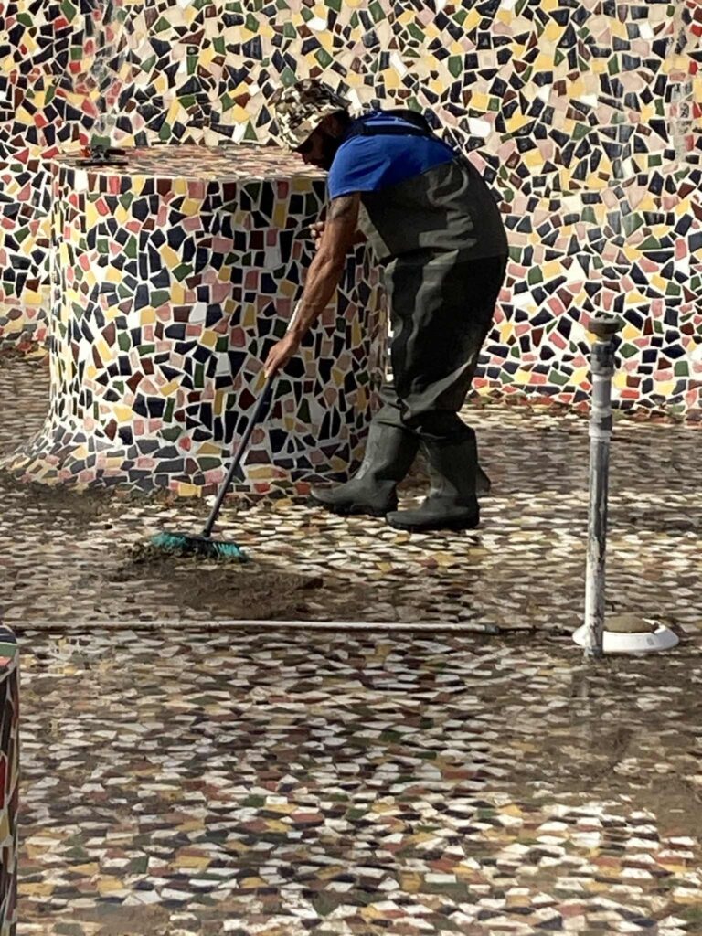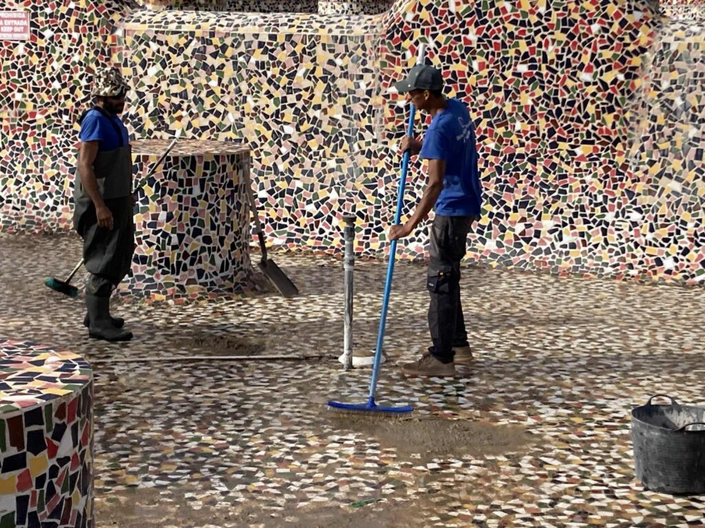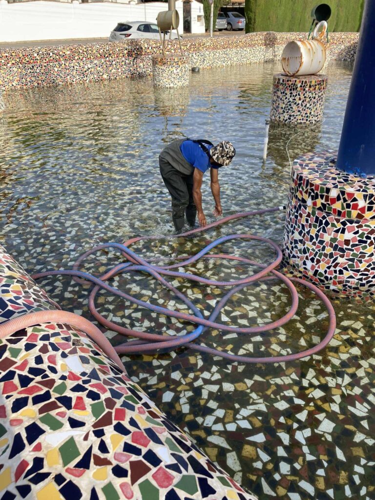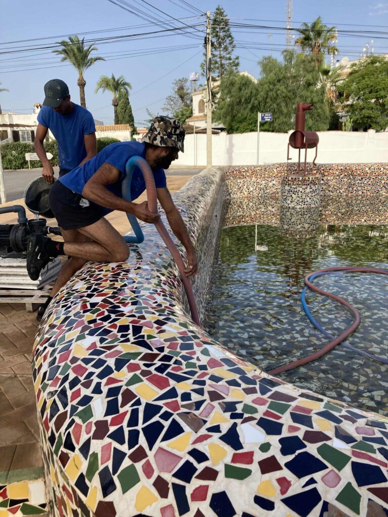 Animal Fountain Update: Work has been ongoing for several weeks on the animal fountain. We discovered a few months ago that the fountain was leaking a lot of water at a large cost to the community, which is why we emptied it. Since then we have started to clean the tiles to remove any limescale and have now discovered that several areas will need retiling where the tiles have blown. Once this work is complete the plan is to seal the whole fountain with a special flexible sealant to protect both the tiles and the grout, hopefully giving it several more years going forward. We have also had the lights on the bottom of the fountain repaired which have not worked for over 14 years!