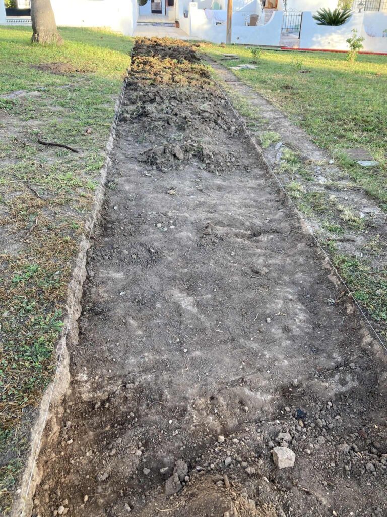 After receiving the latest water bill we have discovered that we have a large leak in this area. The existing pipe runs somewhere on the far side of the meadow between the pine trees. Given that we do not know its exact location and that the pipe is over 35 years old we have made the decision to install a new pipe rather than attempt a repair which may or may not last. This also means we know exactly where it is should we have any problems in the future.